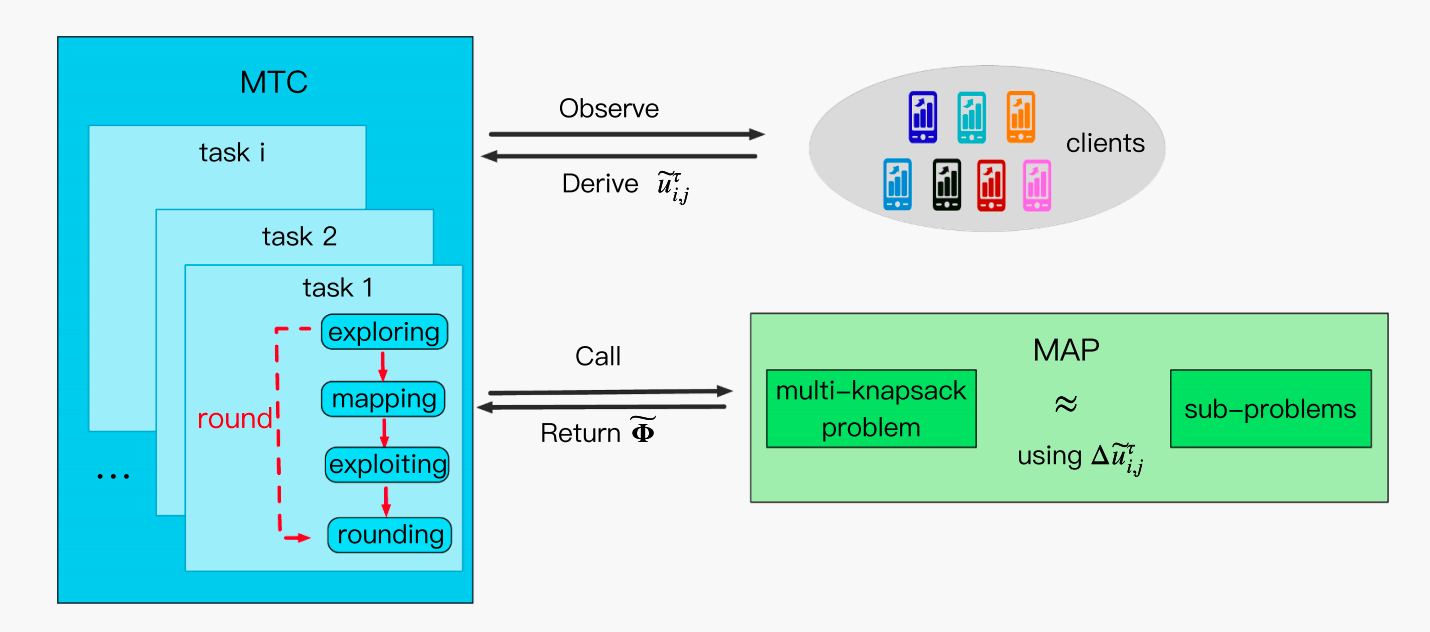 针对上述问题,论文提出了一种新的在线客户选择算法MTC(Multi-task Client selection)。该方法将客户选择过程建模为多智能体多臂老虎机问题,并引入比例公平机制,在保证训练效率的同时提升客户参与的公平性。算法通过探索、映射、利用和随机舍入四个阶段,实现对客户性能的动态学习和资源的合理分配。